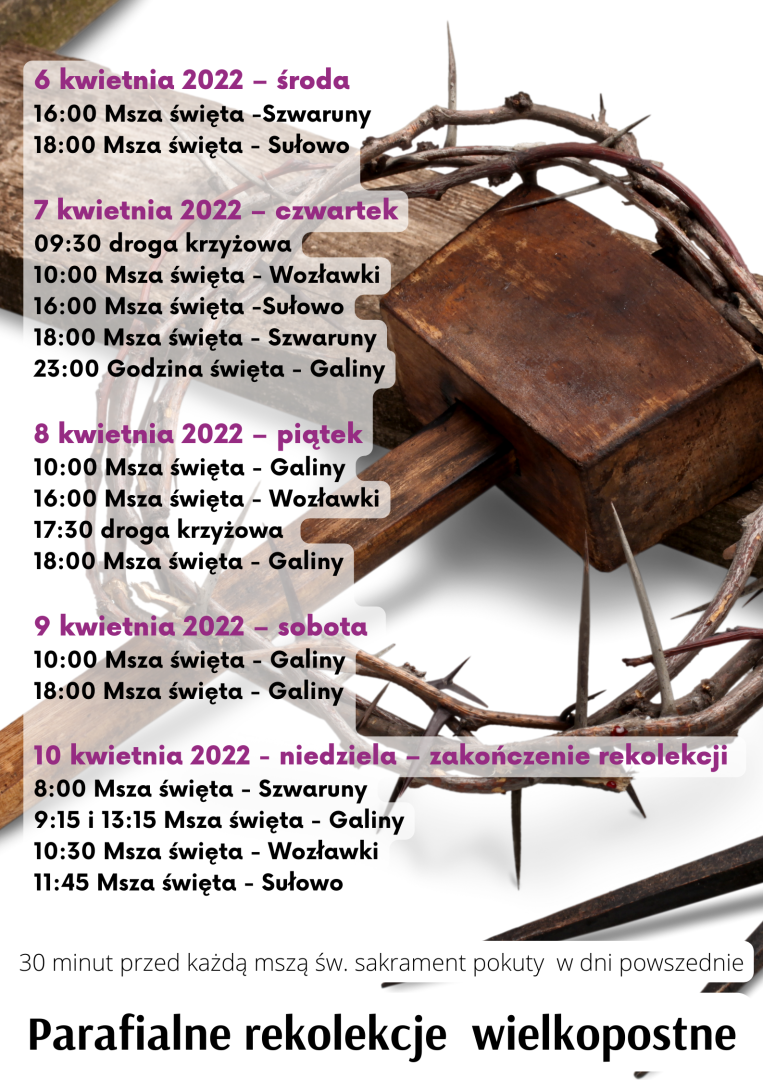 - Od środy w naszych parafiach rozpoczynamy rekolekcje wielkopostne. Bardzo proszę uważnie zapoznać się z grafikiem dla poszczególnych parafii dostępnym w biuletynie parafialnym, na tablicy ogłoszeń oraz na stronie internetowej.